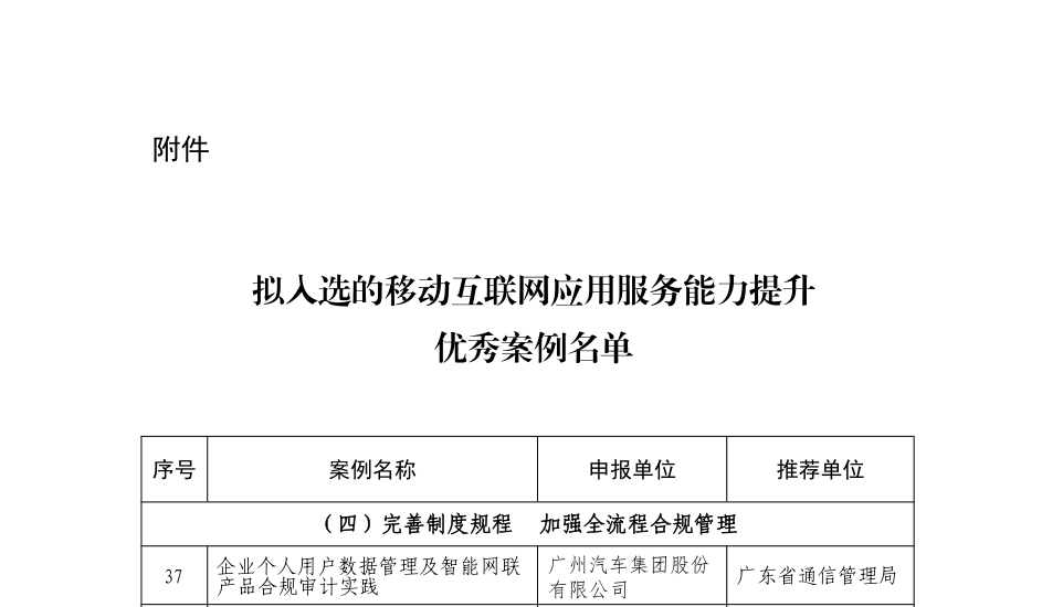 汽车行业已进入数字化、电动化、网联化、智能化时代,为了提升企业数据安全合规管理能力,保护个人、组织的合法权益,广汽集团审计部在市国资委的指导下,对投资企业开展信息系统审计,并将审计经验和成果形成《企业个人用户数据管理及智能网联产品合规审计实践》案例,参与国家工业和信息化部的2023年移动互联网应用服务能力优秀案例评比活动,经专家评审后,获评优秀案例。