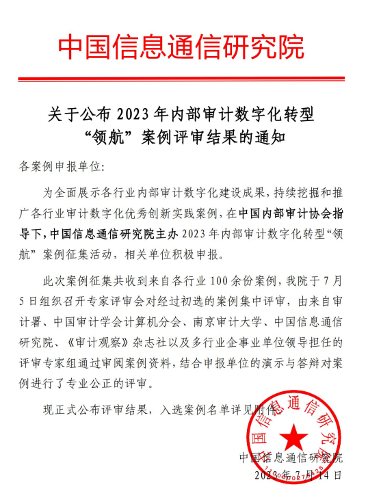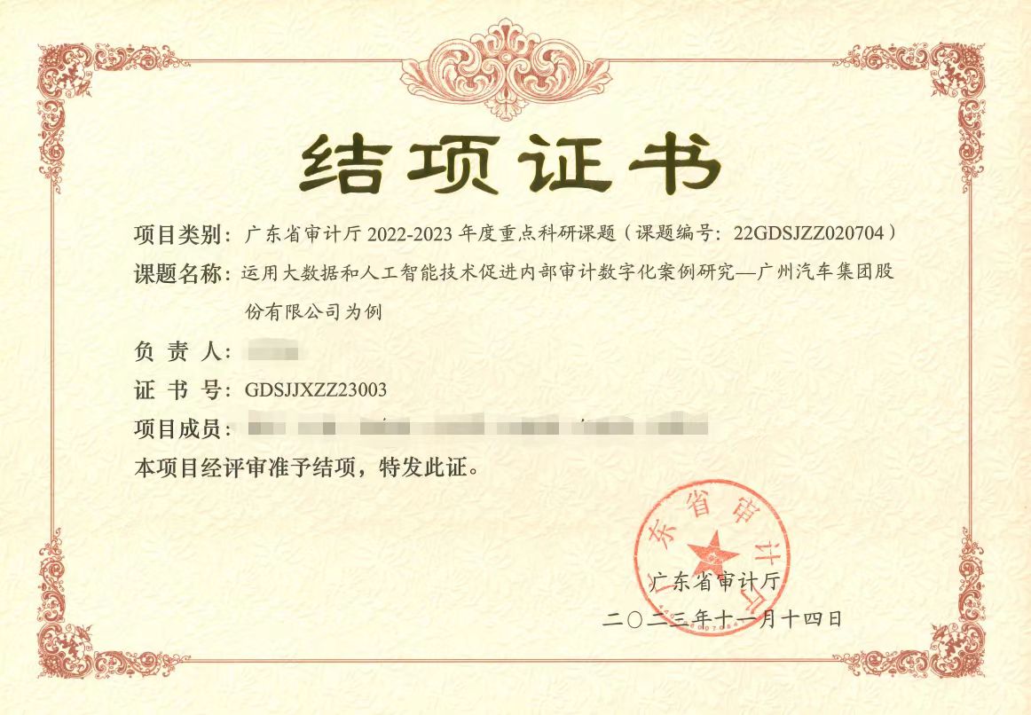 2023年11月,广汽集团审计部承担的“运用大数据和人工智能技术促进内部审计数字化转型案例研究”科研课题,获广东省审计厅评审通过,并颁发结项证书。该课题以大数据综合利用为引擎,以智能服务为远景,通过深入研究人工智能算法模型和智能工具在内部审计与风险管理工作中的融合创新应用,构建数智化内部审计综合体系及内部审计数智化成熟度评价模型,为国有企业内部审计数字化转型提供可借鉴的实践参考。