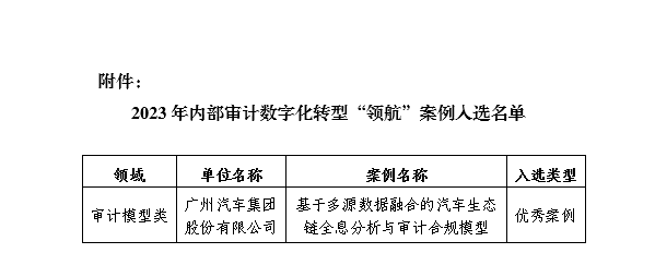 一直以来,广汽集团审计部牢记习近平总书记提出“科技强审”的要求,积极开展审计数字化转型,通过解决复杂的用数环境,基本形成跨企业、跨领域、多维度的智能化大数据审计模式。其中“基于多源数据融合的汽车生态链全息分析与审计合规模型”项目被中国信息通信研究院评为2023年内部审计数字化转型“领航”案例的审计模型领域优秀案例,相关经验也刊登在中国时代经济出版社出版的《数智领航》和《中国审计》等书籍杂志。