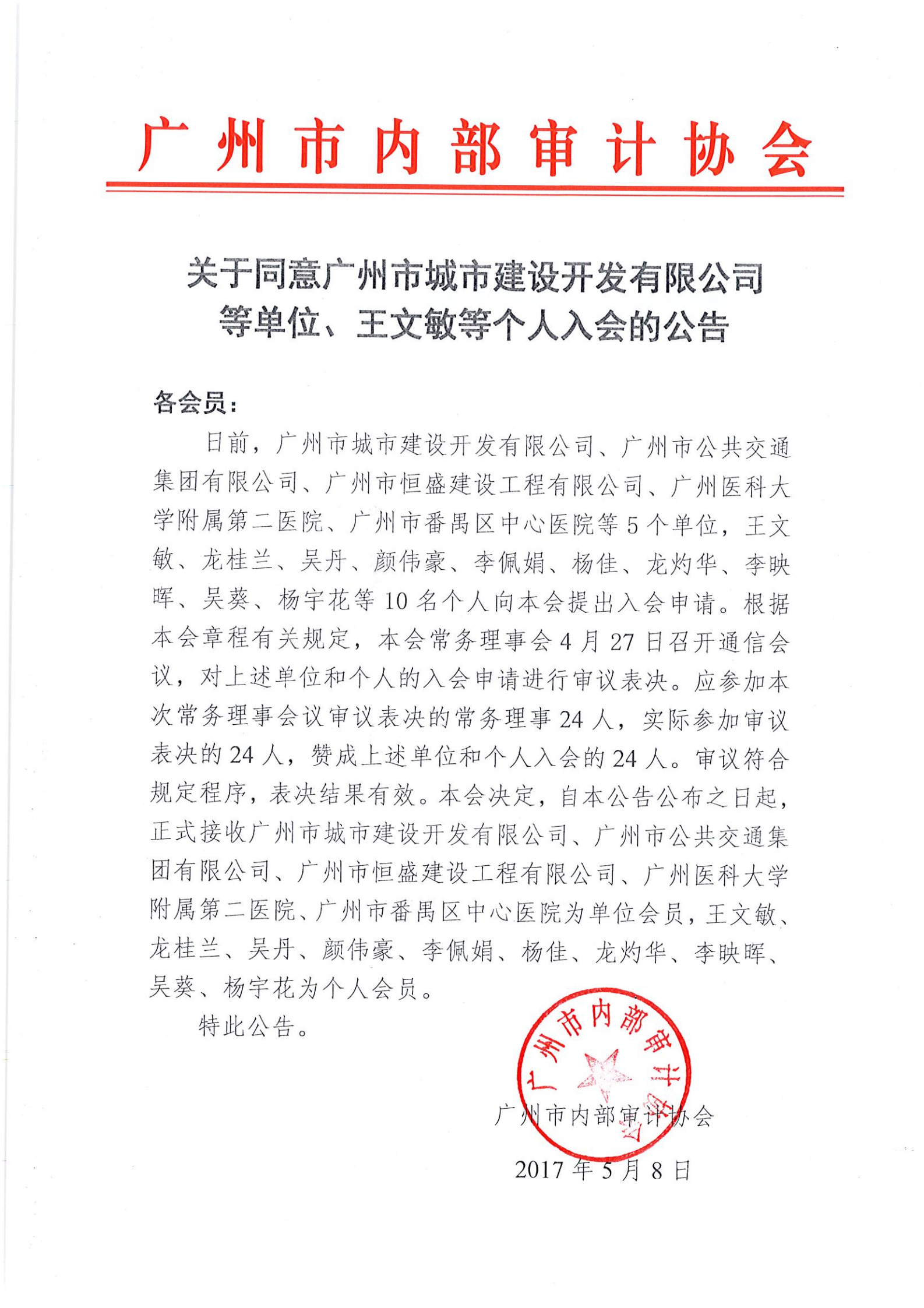 关于同意广州市城市建设开发有限公司等单位、王文敏等个人入会的公告.pdf (351.86 K)
