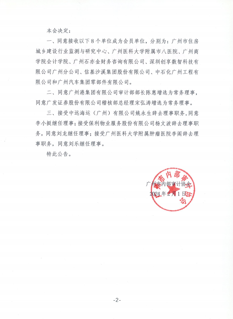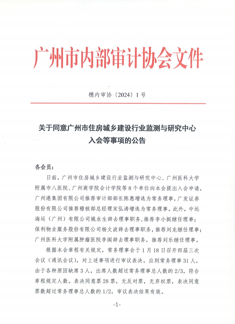 附件:穗内审协〔2024〕1号 关于同意广州市住房城乡建设行业监测与研究中心入会等事项的公告.pdf