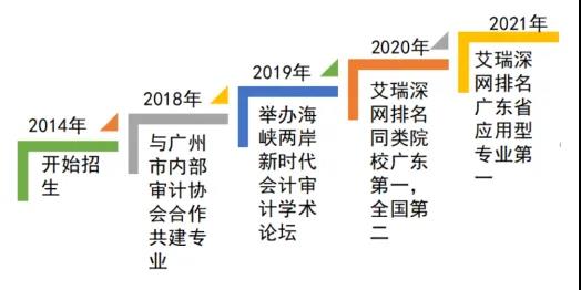 ·2021年,在艾瑞深校友会网专业分类列示,会计学、财务管理、审计学三个专业均位列广东省应用型专业第一名,其中会计学和财务管理两个专业为中国顶尖应用型专业,审计学为中国高水平应用型专业。